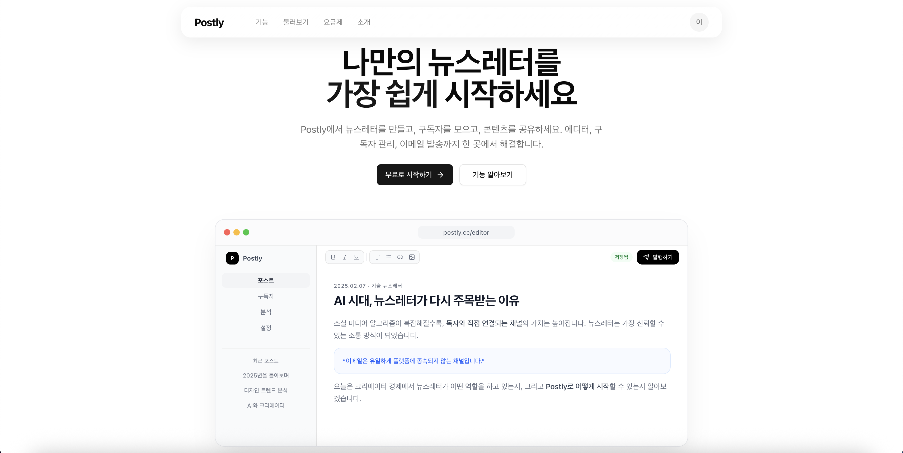 나만의 뉴스레터를 가장 쉽게 시작하는 방법 — Postly(포슬리) 뉴스레터를 시작하고 싶었지만, 해외 서비스의 높은 가격과 복잡한 설정에 망설이셨나요? 구독자에게 콘텐츠를 보내려면 이메일 서비스, 블로그, 랜딩 페이지, 분석 도구를 따로따로 붙여야 했던 경험이 있으신…